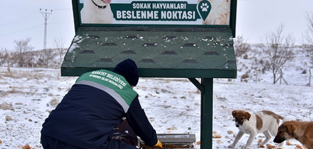 Karatay Belediyesi Veteriner İşleri Müdürlüğü ekipleri, kar yağışıyla birlikte yabani ve sokak hayvanlarının yaşamlarına devam edebilmesi için ilçenin birçok noktasına kurduğu kedi ve köpek besleme istasyonlarına yem bıraktı.