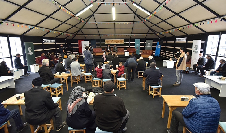 Mevlana Meydanı’nda kurulan çadırda gerçekleştirilen etkinliklerle dünyanın dört bir yanından Konya’ya gelen Hz. Mevlana’nın misafirleri, 10 gün boyunca sanata, kültüre ve müziğe doyacak. Karatay Belediye Başkanı Hasan Kılca da, “İrfan Vakti Sohbetleri” kapsamında kendisini dinlemeye gelen misafirlere Karatay’ı, Konya’nın manevi mimarlarını ve belediyenin tarihi, kültürel ve sosyal çalışmalarını anlattı.