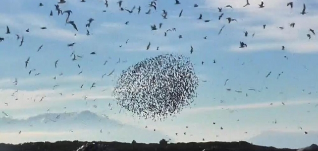 Sığırcıkların havadaki bu dansına zaman zaman martı sürüleri de eşlik etti.