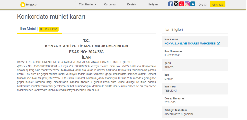 Konya merkezli Erkon Süt Ürünleri Gıda Tarım ve Ambalaj Sanayi Ticaret Limited Şirketi, mali zorluklar nedeniyle konkordato başvurusunda bulunduğunu açıkladı.