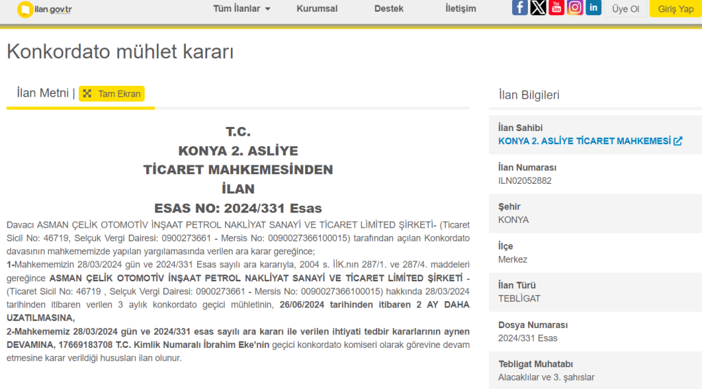 1-Mahkememizin 28/03/2024 gün ve 2024/331 Esas sayılı ara kararıyla, 2004 s. İ.K'nın 287/1. ve 287/4. maddeleri gereğince ASMAN ÇELİK OTOMOTİV İNŞAAT PETROL NAKLİYAT SANAYİ VE TİCARET LİMİTED ŞİRKETİ - (Ticaret Sicil No: 46719 , Selçuk Vergi Dairesi: 0900273661 - Mersis No: 090027366100015) hakkında 28/03/2024 tarihinden itibaren verilen 3 aylık konkordato geçici mühletinin, 26/06/2024 tarihinden itibaren 2 AY DAHA UZATILMASINA,