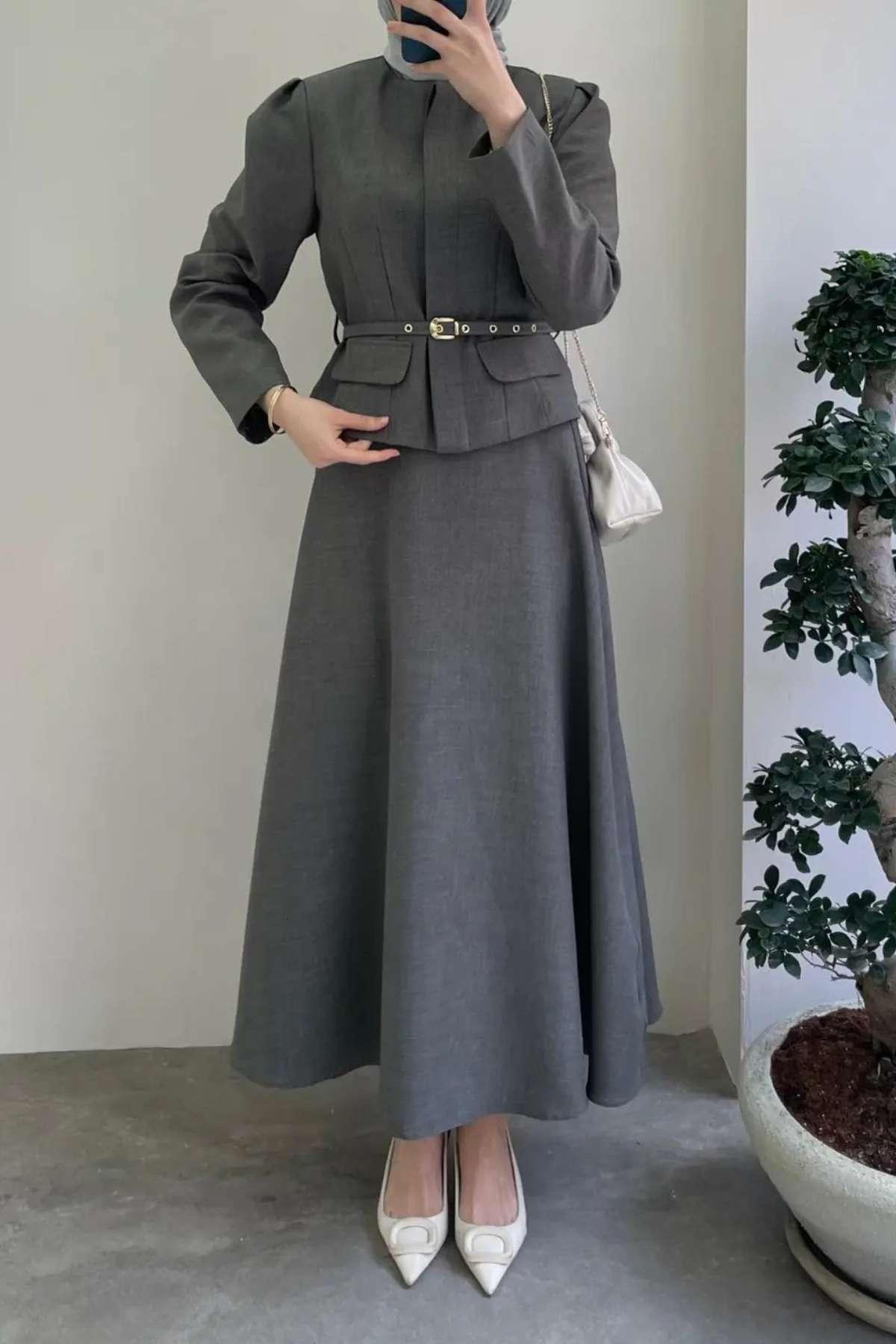 Nowan Store ceket-etek tesettür takım modelleri, bayram ziyaretlerinde klasik bir şıklık oluşturabilir. Bel kemerli tasarımlar, orantılı bir görünüm sunarken; sade renk paleti kombin kolaylığı sağlar.
