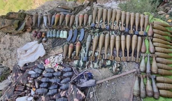 "5 adet el bombası, 10 adet 82 mm havan, 1 adet el yapımı 82 mm havan, 65 adet 82 mm havan mühimmatı, 50 adet Doçka mühimmatı, 3 adet AK-47 piyade tüfeği şarjörü, 500 adet 7.62 mm PKMS makinalı tüfek mühimmatı, 180 adet 5.56 mm mühimmat, 25 kg amonyum nitrat patlayıcı, 52 adet 82 mm hassas tapa, 6 adet gaz bombası, 2 bin m kablo, 4 adet hilti ucu, 1 adet gaz ocağı, 4 adet matkap ucu,1 adet termal şemsiye,15 adet örgütsel doküman, Çok sayıda muhtelif yaşam malzemesi."