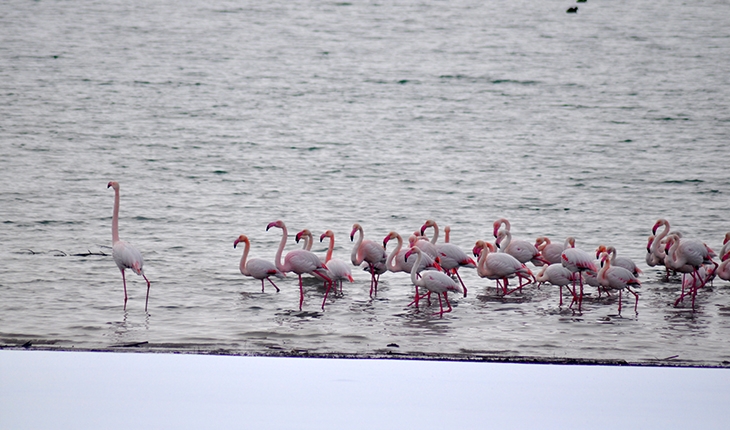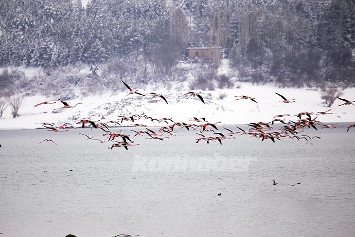 Ülke genelindeki sulak alanların donması nedeniyle flamingolar, suyu donmayan baraj gölü ve sulama göletlerine yöneldi.