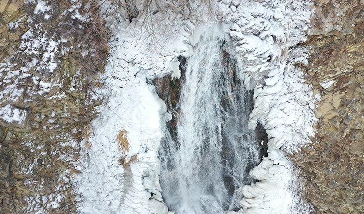 Dron ile görüntülenen şelale, ziyaretçilerine farklı görseller sunuyor.Vatandaşlardan İsmail Ayaz, bölgede kar yağışının etkili olmadığını ancak soğuk hava nedeniyle sulak alanların, şelalelerin donduğunu söyledi.