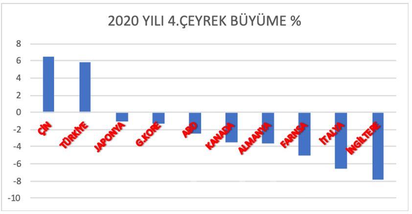 Ülkemiz 2020 yılında G20 ülkeleri içinde Çin ile birlikte büyüyen ikinci ülke oldu. 2020 yılı 4.çeyreğinde %5,9 büyüyerek 2020 yılı genelini ise %1,8 büyüme ile tamamladık. 2020 yılı ile ilgili 2.çeyrek daralması %9,9’dan %10,3 ve 3. Çeyrek büyümesi de %6,7 den %6,3 revize edilmiştir.