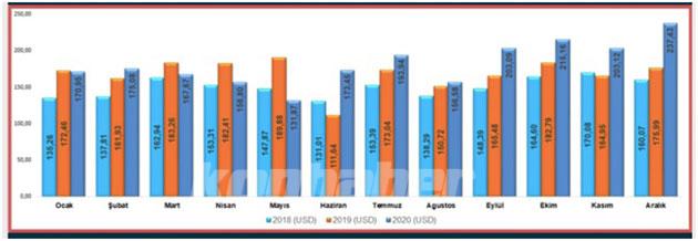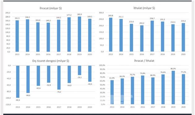 Pandeminin etkisiyle ihracatımız yılın ikinci çeyreğinde 32,4 milyar $ kadar gerilemiştir. Yılın üçüncü çeyreğinde ise büyümenin de etkisi ile hızlı bir toparlanma olmuştur. Aralık ayında ihracatımız yıllık %16 artışla 17,84 milyar $ ile tüm zamanların en yüksek aylık rakamına ulaşmıştır. 2020'nin son çeyreğinde 51,2 milyar $ ihracatla en yüksek çeyreklik rakama ulaşılmıştır. Grafikte 2013-2020 yılları arasında ihracat, ithalat, dış ticaret açığı ve karşılama oranları mevcut.