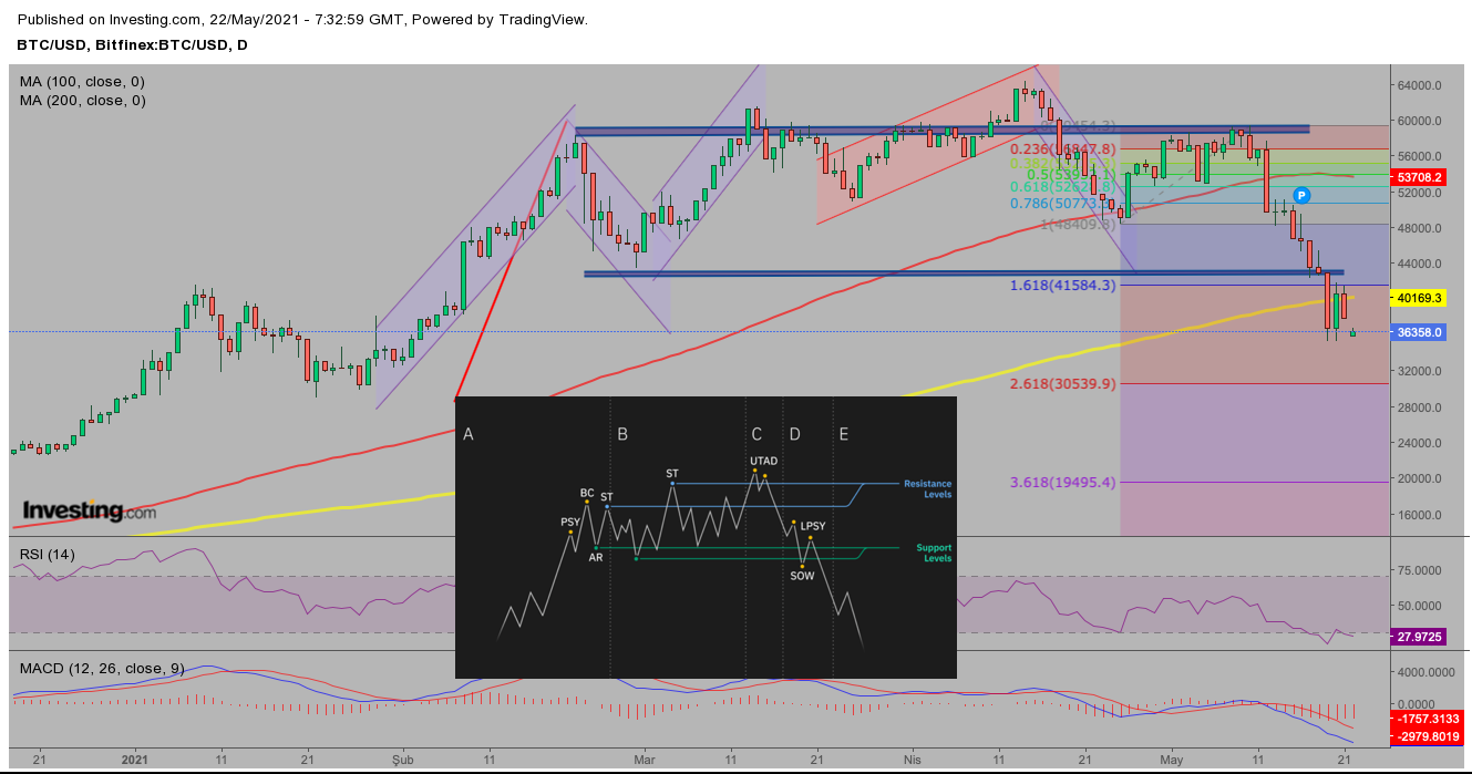 Teknik olarak baktığımızda sarı ile belirtilen 200 günlük ortalamanın altında kaldığımız takdirde 30 bin $ seviyelerine kadar geri çekilmeler görebiliriz. Ayrıca birçok kişinin son günlerde paylaştığı gibi Wyckoff analizine benzeyen bir durum söz konusudur. Grafiğin orta kısmında yer alan küçük siyah grafik Wyckoff analizine ana grafiğin benzediği görülmektedir. Önümüzdeki hafta bir ayı piyasası mı başlıyor cevabını alabiliriz. Ayı piyasası olsa bile geçmiş yıllardaki kadar uzun sürmeyeceğini düşünüyorum nedeni de piyasa hacminin çok ciddi seviyelere ulaşmasıdır. Tabi ki teknik çalışmaların yanında gelecek haber akışları da fiyatların yön bulmasına yardımcı olacaktır.