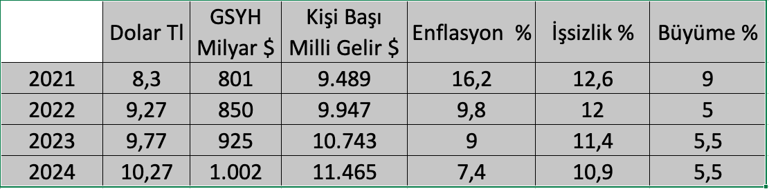 Türkiye ekonomisi 2013 yılında 957,8 milyar $ ve 12.615 $ kişi başı milli gelir ile zirve yapmış ve daha sonra bu rakamlar gerilemeye başlamıştır. Geriye dönüp baktığımızda 10 yıl önceki gerçekleştirilen rakamlar bugün tekrardan hedef olmuştur. 2013 yılında Cumhuriyetimizin 100. Yılı 2023 için verilen hedefler ise; GSYH 2 trilyon $ ve Kişi başı milli gelir 20 bin $ olan hedeflerin bugün üzülerek çok uzağında kaldığımızı belirtirim. Hedeflerin neden uzağında kalıyoruz? Bu soruya cevap arayarak ve hedeflerimizi benimseyerek, inanarak çalışmalıyız. Gerçekçi hedeflerin yapılmaması için bir neden yoktur.
