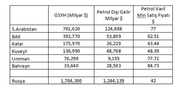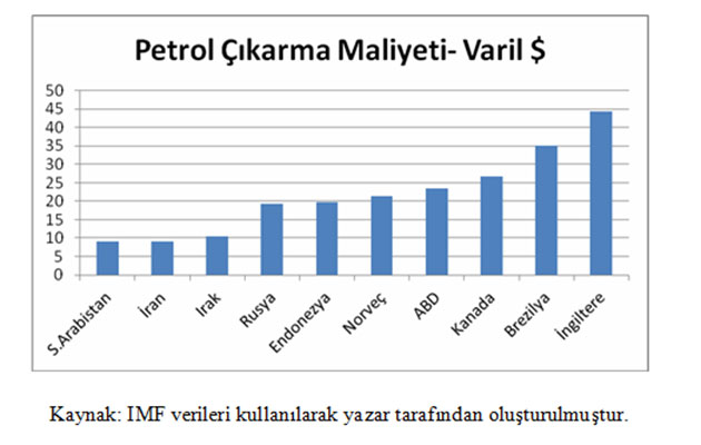 Petrol çıkarılma maliyetleri yukarıda görülmektedir. S.Arabistan en düşük maliyetle petrol çıkartmaktadır fakat bütçe gelirlerinde % 83 bir payın olması yani petrol dışı gelirlerinin neredeyse olmaması sebebiyle fiyat düşüklüğü bütçe dengelemelerinde sorun yaşayacaklardır. Bu durum petrol dışı gelirlerin çok az olduğu körfez ülkeleri için uzun vadede sürdürülebilir bir durum değildir. Rusya'da petrol fiyatında her 10 dolarlık düşüş, döviz gelirlerini ortalama 20 milyar dolar azaltmaktadır. Bu durumun Rusya için de sürdürülemez olduğu aşikârdır.