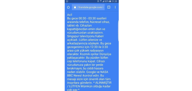 Mesajda Singapur televizyonu haberine yer veriliyor. Gece saat aralığı verilerek Dünyamızdan gezegen olarak bahsedilip yüksek radyasyon geleceğinden bahsediliyor. Bu doğrultu da tüm elektronik cihazların kapatılması söyleniyor.