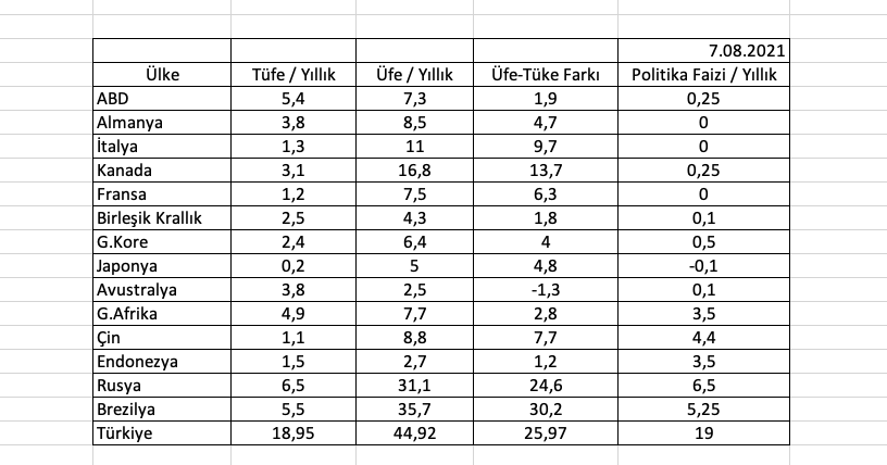 Geçmiş yıllara baktığımızda ise tablonun ne kadar kötü olduğu aşikardır. 2004-2016 yılları arasında enflasyon ortalamasına baktığımızda tek haneli hareket etmişti (%8,3). Geçtiğimiz hafta açıklanan enflasyon verisine baktığımızda ise %18,95 ile rekor kırmıştık. Üretici fiyatları (ÜFE) ise %44,92 ile yine artış meydana gelmiştir. ÜFE ile TÜFE arasındaki makasa da her geçen ay açılmaktadır. Tablolaya baktığımızda ise ülkelerin bu konudaki verilerini görüyoruz ve Brezilya, Rusya bizim gibi kırılgan beşlide yer alan ülkelerde de bu ÜFE TÜFE farkının açıldığı görülmektedir. Buradaki en temel nedenlere bakacak olursak; son dönemde yaşanan gıda ve emtia fiyatlarındaki artış, hammadde fiyatlarındaki artışlar olumsuz etkilemektedir. Bizim özelimizde değerlendirirsek ise karşımıza; ÜFE’nin vergi hariç satış fiyatını, TÜFE’ninse vergi dahil satış fiyatını baz alınmaktadır. Bu durumda haliyle farklılık yaşanmasına neden olmaktadır. Örneğin petrol fiyatlarında yaşana bir %5 artış olduğunu varsayalım bu durum ÜFE’ye %5 olarak yansımaktadır fakat TÜFE tarafına ise vergiler dahil edildiğinde %5 daha az bir etkisi olmaktadır. Vergi ve ÖTV kaynaklı farklılaşma olmaktadır.